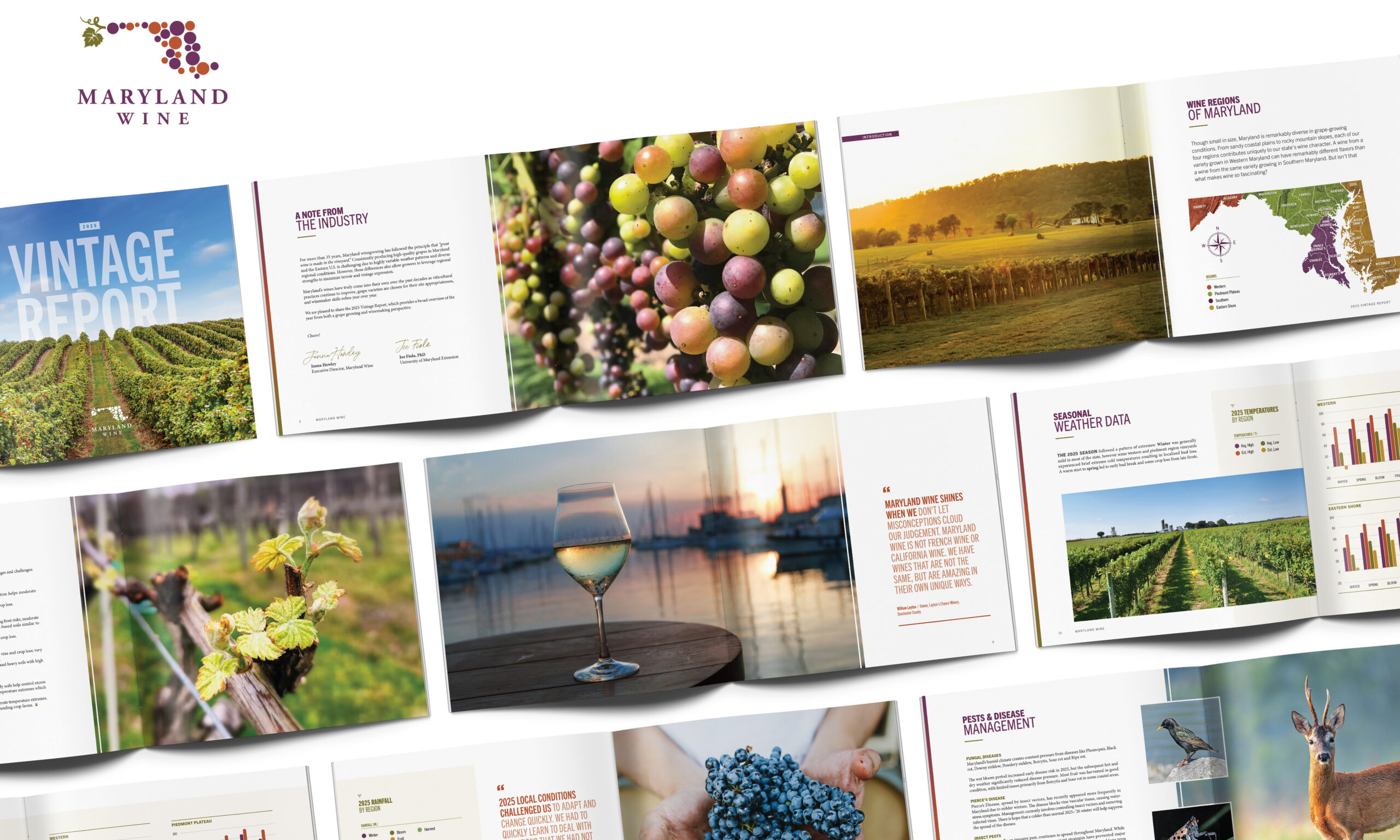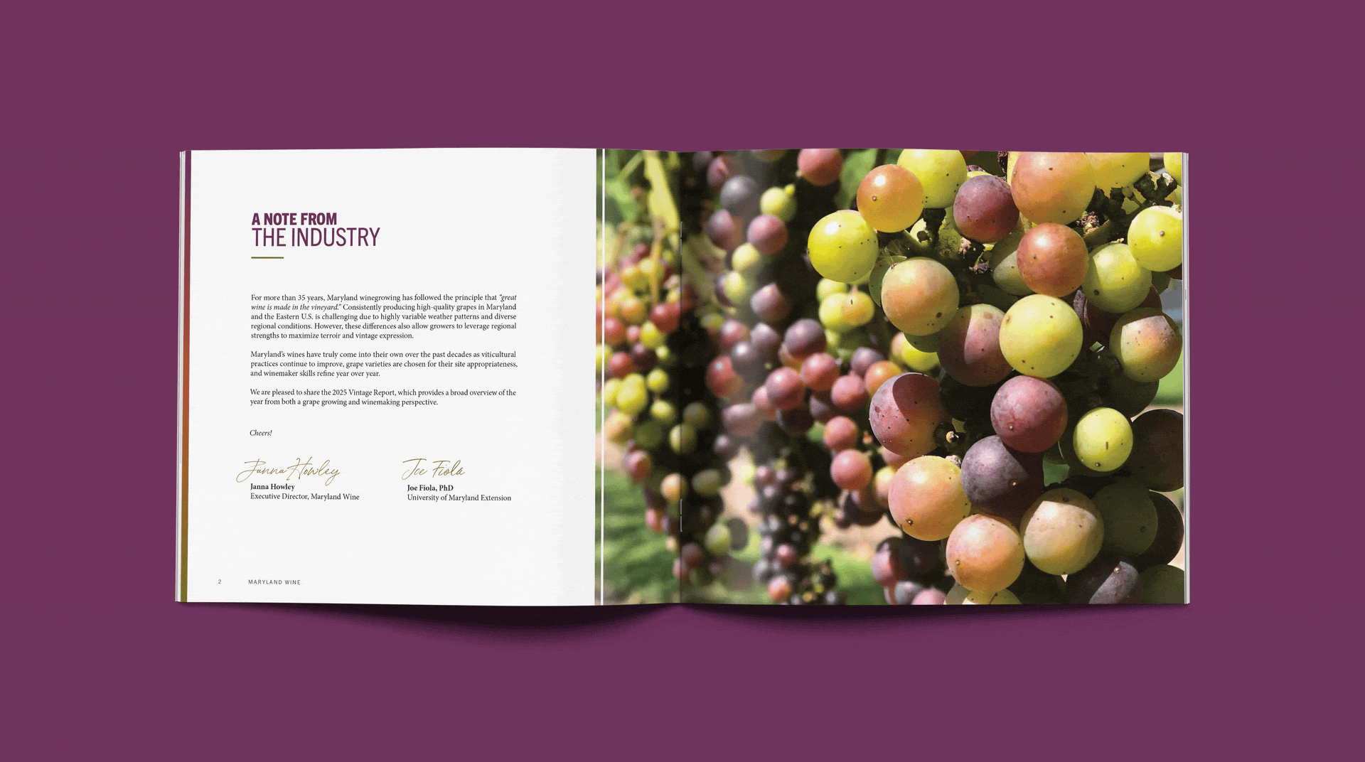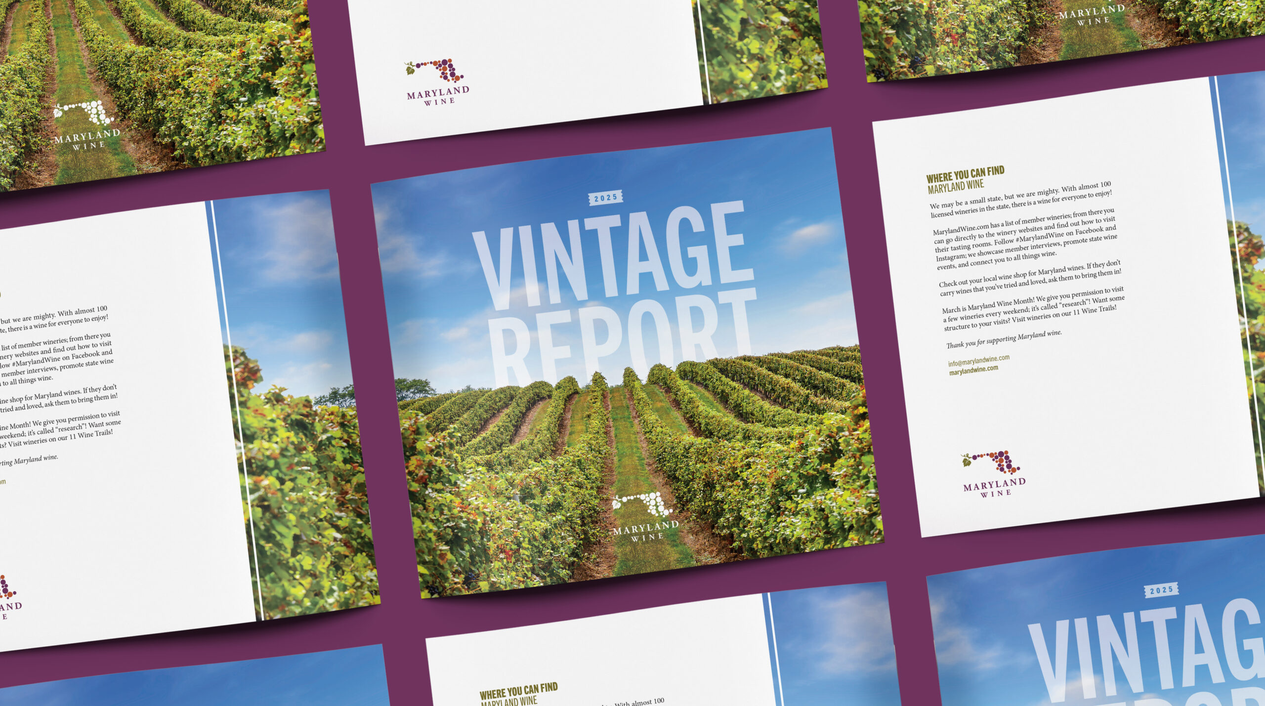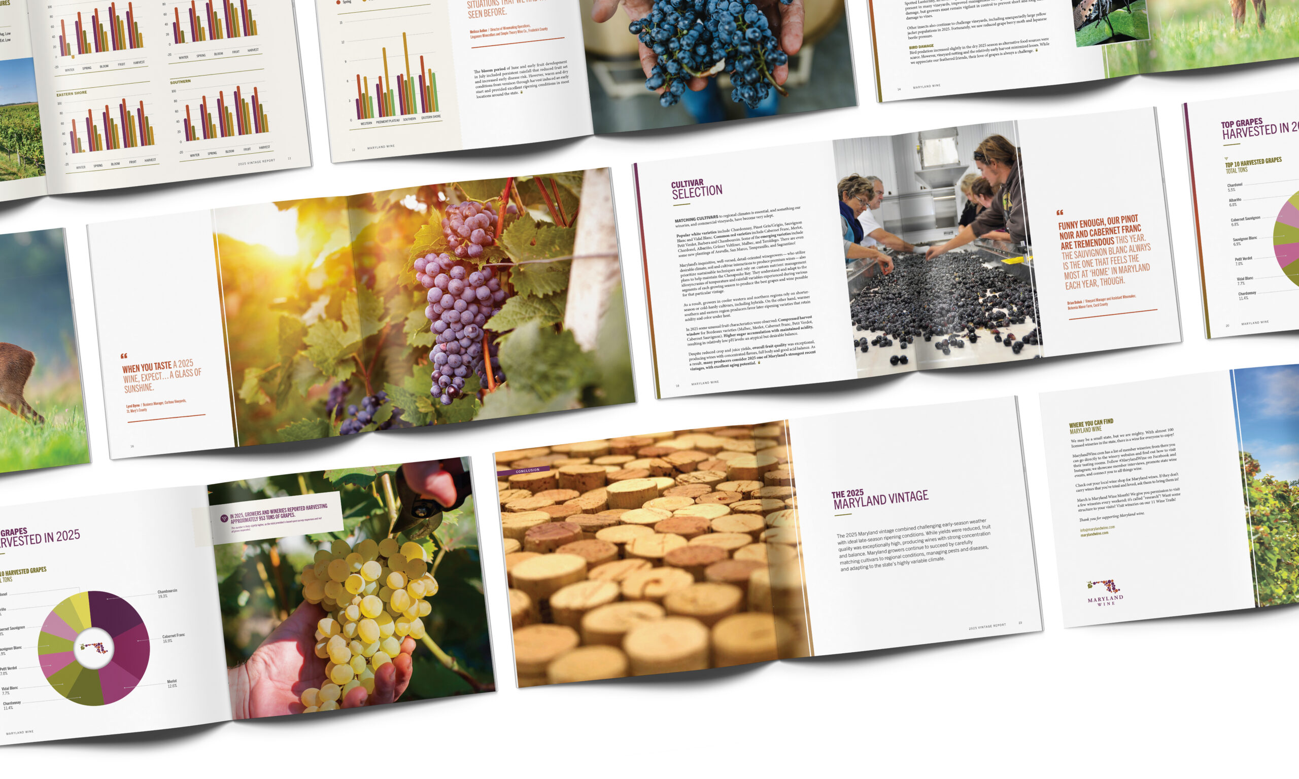 THE 2025 VINTAGE REPORTMWA partnered with Lisa Sirbaugh Creative to reimagine its 2025 Vintage Report with a more refined, contemporary design approach—one that reflects the sophistication and continued growth of Maryland’s wine industry. The refreshed design focused on enhanced storytelling, pairing thoughtful typography with curated imagery and purposeful graphic elements to create a cohesive, engaging narrative throughout. We also reformatted the publication to introduce a print edition, extending its reach beyond digital and creating new engagement opportunities at events, expos, and industry gatherings. The report itself offers a comprehensive look at Maryland’s wine landscape, featuring insights into the state’s distinct growing regions, seasonal weather conditions, and the environmental factors that shaped the 2025 harvest. Supporting content highlights key considerations such as pest and disease management, cultivar selection, and top-performing grape varieties—complemented by a series of winemaker perspectives that add depth and a firsthand voice to the story. The Maryland Wine 2025 Vintage Report reflects a thoughtful balance of strategy and execution—bringing clarity, structure, and visual refinement to a complex body of information. The result is a cohesive, well-crafted publication that not only documents the 2025 year but also strengthens how Maryland’s wine industry communicates its expertise, credibility, and continued evolution.
